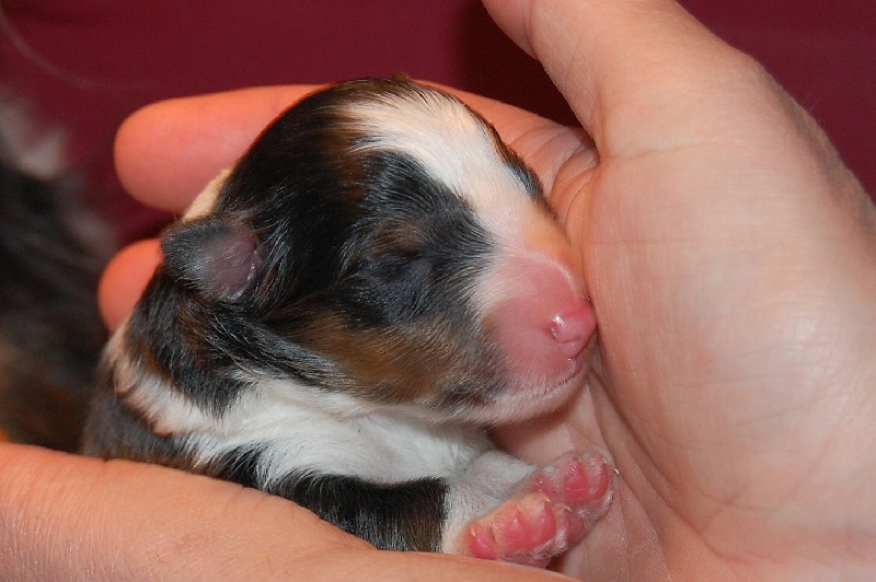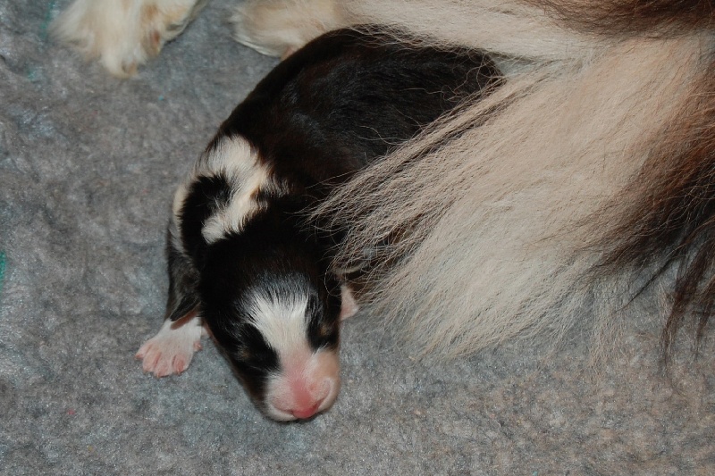 Altaï se remet à contracter et à pousser, des petites pattounes arrières et un petit cul apparaîssent: un siège, comme "prévu" ! Caty aide le petit à évacuer le liquide amniotique qu'il a dans les narines. La poche était crevée, il a bu la tasse. Clamp, coupe et noeud au cordon, et voilà un petit mâlou tricolore a pointé sa petite bouille à 3h !