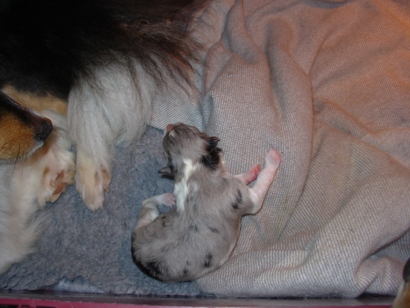 Nous arrivons chez Caty & July vers 2h40, la puce bleue se "branche" goulûement aux mamelles de sa mère, bien au chaud sous la lampe.